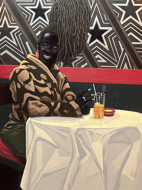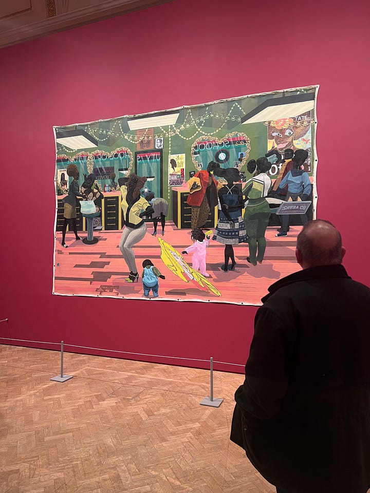 I was in awe of the ambience and energy of the room, completely fixated on the beautiful, mesmerising paintings on the deep red walls. Marshall truly mastered the art of emulating and emphasising the power of Blackness. It felt like reliving my childhood or maybe the shared childhood memory of every Black child. I recognised the faces staring back at me. This was my auntie, my uncle, my dad, my mum, my hairdresser, my art teacher. It felt like walking backward through time, retracing the moments that shaped me into the woman I am today.